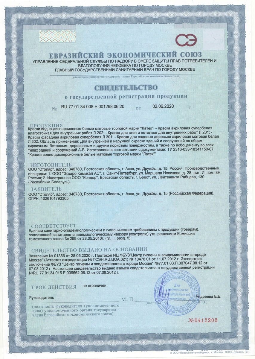 Состав. Латекс акриловый, диоксид титана, наполнители, загуститель, технологические добавки, вода.