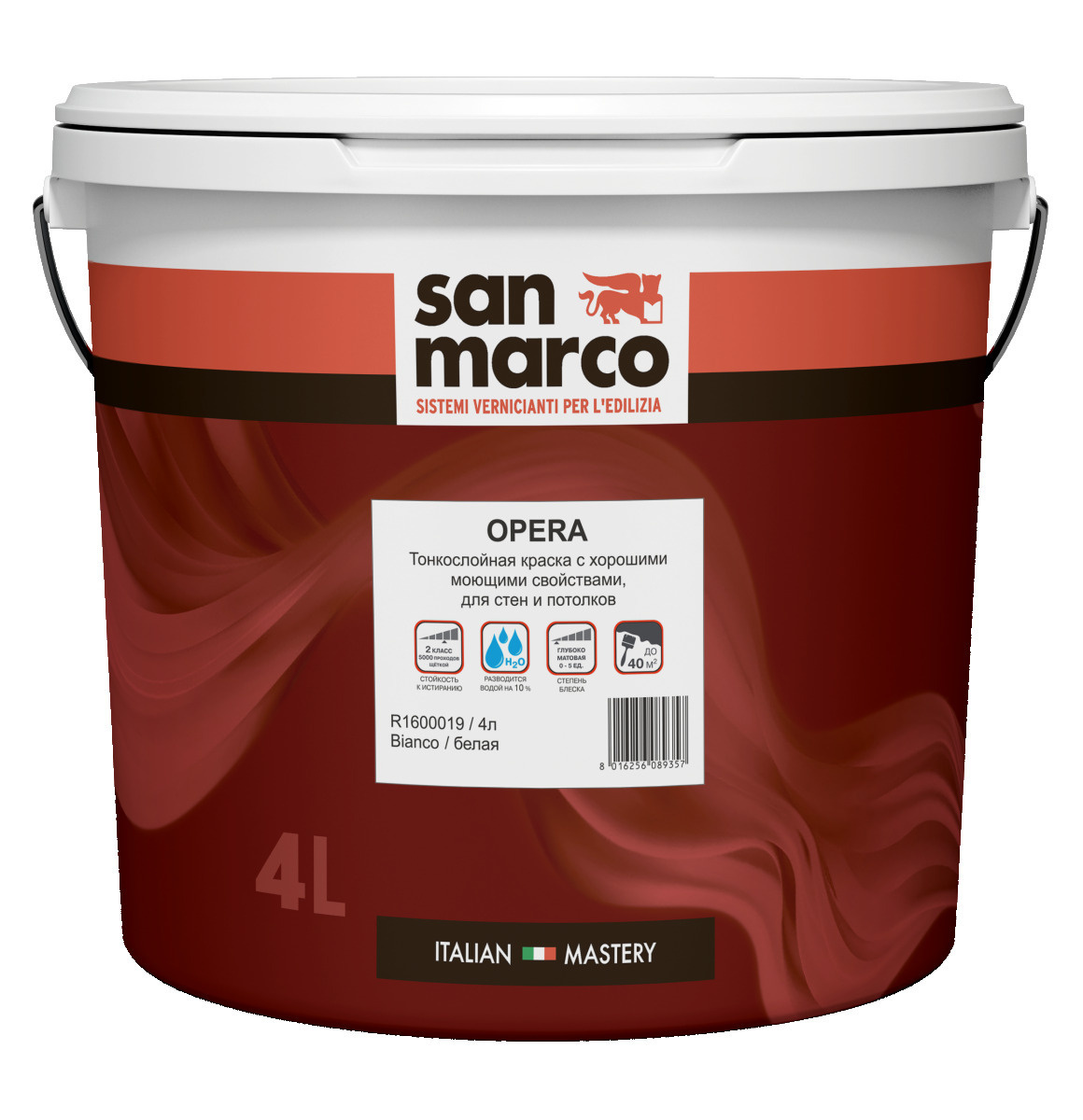 Opera (Опера) - это глубоко-матовая интерьерная краска с отличными моющими свойствами для потолков и больших поверхностей, позволяет создавать высококачественную однородную отделку. Характеризуется высокой белизной и хорошей маскирующей способностью. Благодаря глубоко матовому аспекту краска Опера от Сан Марко особенно подходит для покраски потолков, коридоров и больших поверхностей с различными видами освещения.