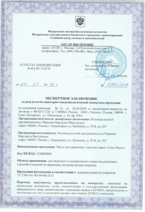 Через 24 часа нанесите повторный слой аналогично первому. Наносить в 1-3 слоя в зависимости от типа и качества обработки древесины. При необходимости колеровки добавьте пигмент «Семь масел». При колеровки первый слой наносится цветной, последний бесцветный. Колерованное масло необходимо перемешивать во время нанесения раз в 5-7 минут. Инструмент очистить раствором тёплой мыльной воды. При нанесении и высыхании масла обеспечьте приток свежего воздуха.