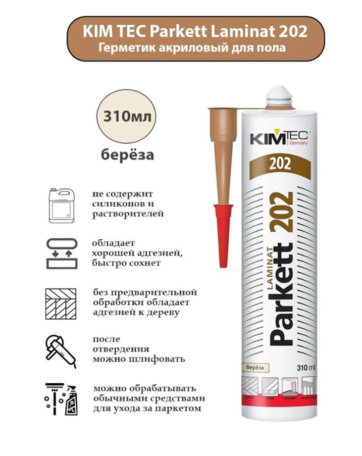 KIM-TEC Parkett-Laminat 202 - это однокомпонентный герметизирующий материал на основе полиакрилатов, не содержащий силиконов и растворителей. Продукт твердеет при испарении воды и превращается в легко шлифуемый пластично-эластичный герметик, который можно обрабатывать обычными средствами для ухода за паркетом.